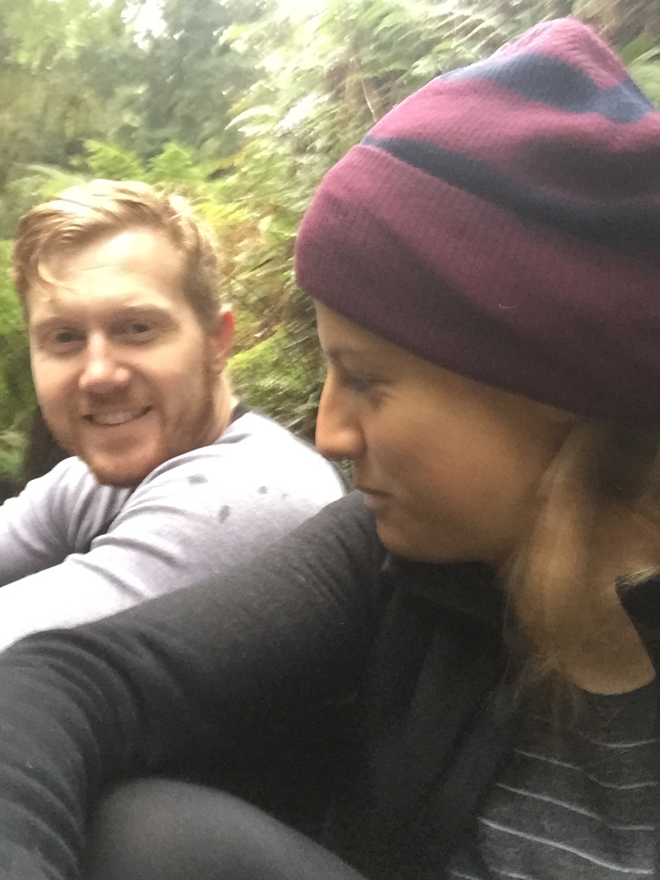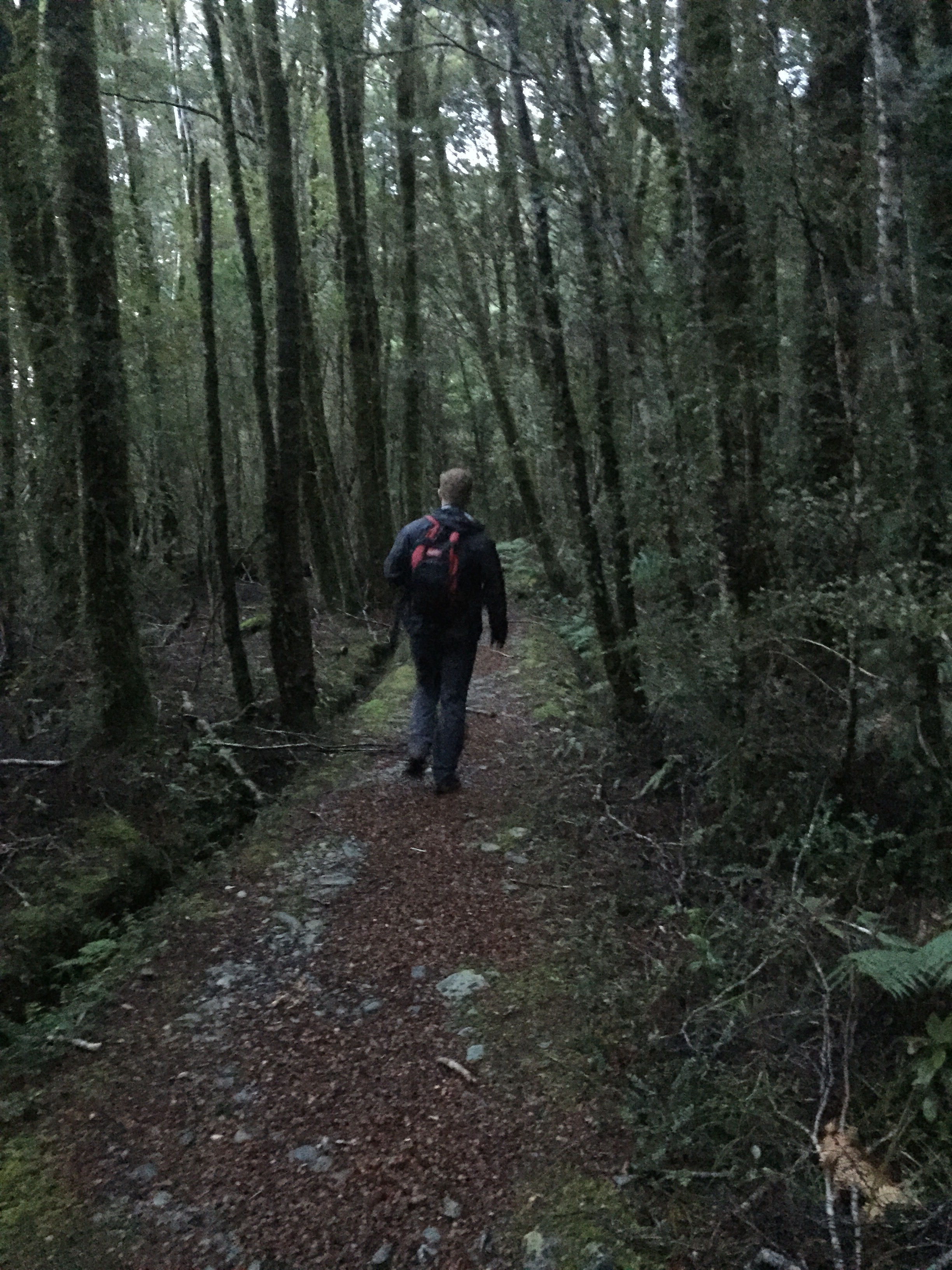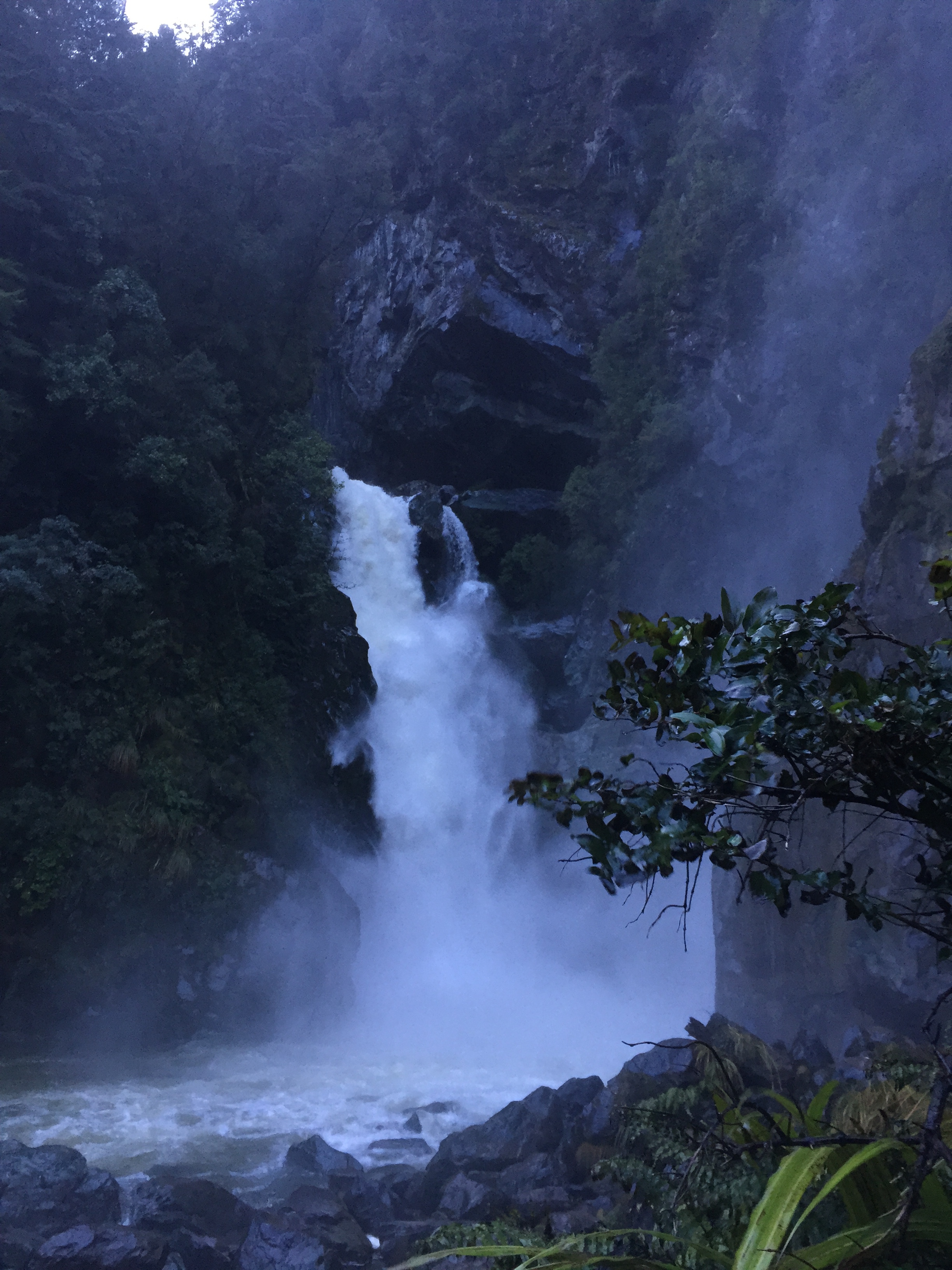 Getting changed under the doona because our fire had burned out and our once cozy little hut was now an ice-box… we put on some wry smiles, falsely positive attitudes and our trekking shoes. It was pitch black, pouring with rain and freezing cold. Choking down a poorly planned breakfast of mandarin and muesli bar, we hopped in the car and drove the 5 minutes to the trail head of the Hollyford track.