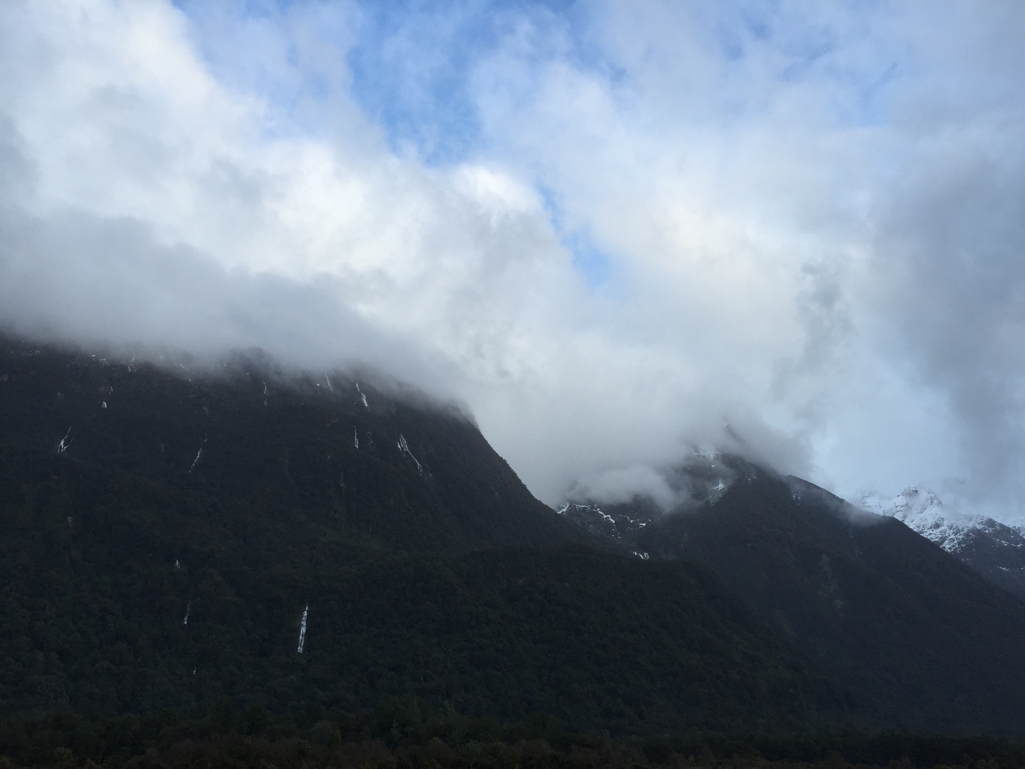 After being rained on for about 8 hours, as soon as we left the sound and got into Te Anau, the sun was out and the beautiful clouds were up to their old tricks again… much to my relief.